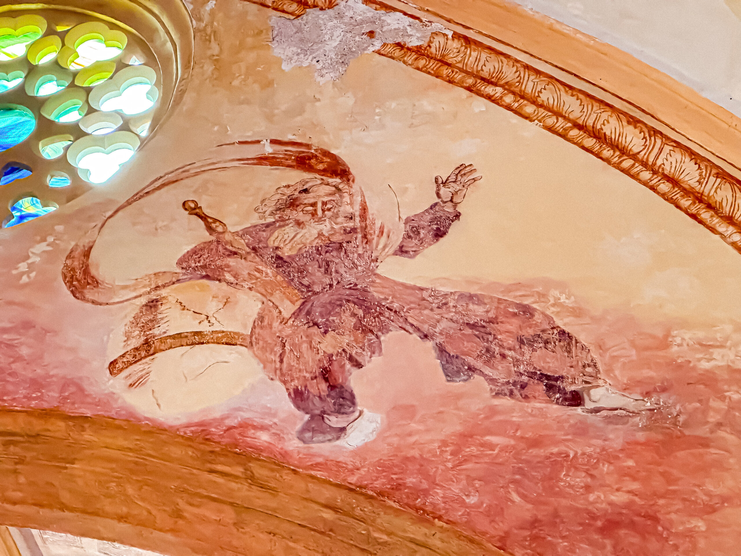 Sur le plafond, il y a une dizaine d’années, lors de la rénovation du crépis, une fresque surprenante a été découverte : Moïse portant la Torah dans ses bras.