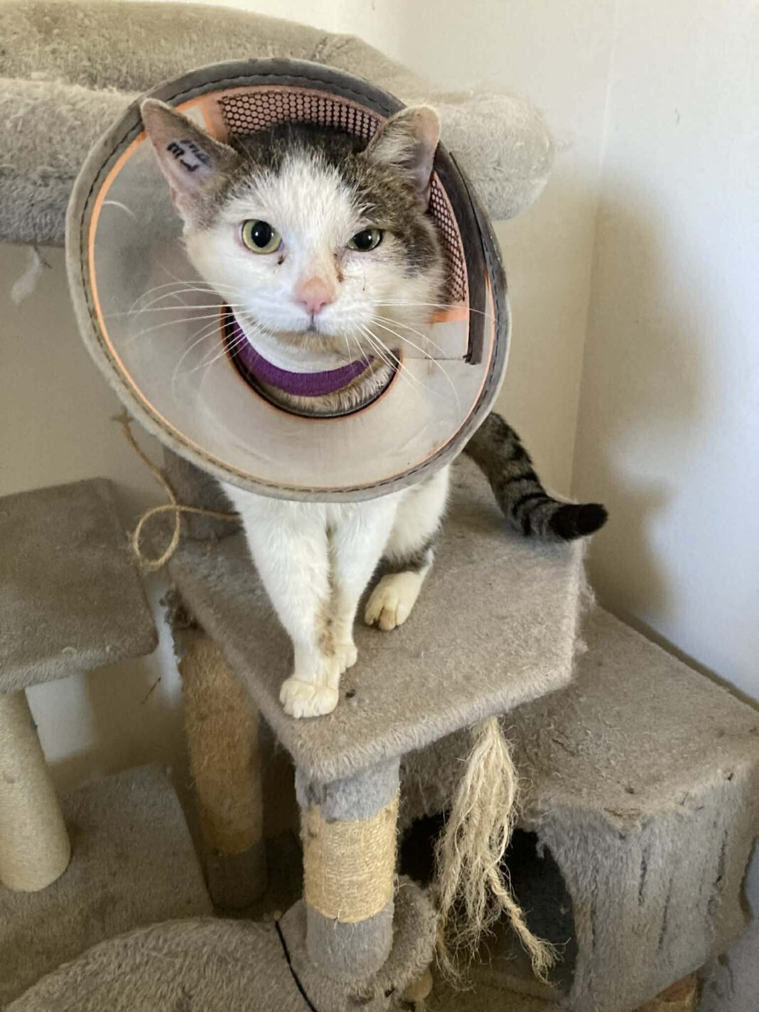 Plusieurs bénévoles de l’association se relaient actuellement pour assurer son suivi. Le jeune chat poursuit sa convalescence à la chatterie de l’association et pourra être proposé à l’adoption une fois totalement rétabli.