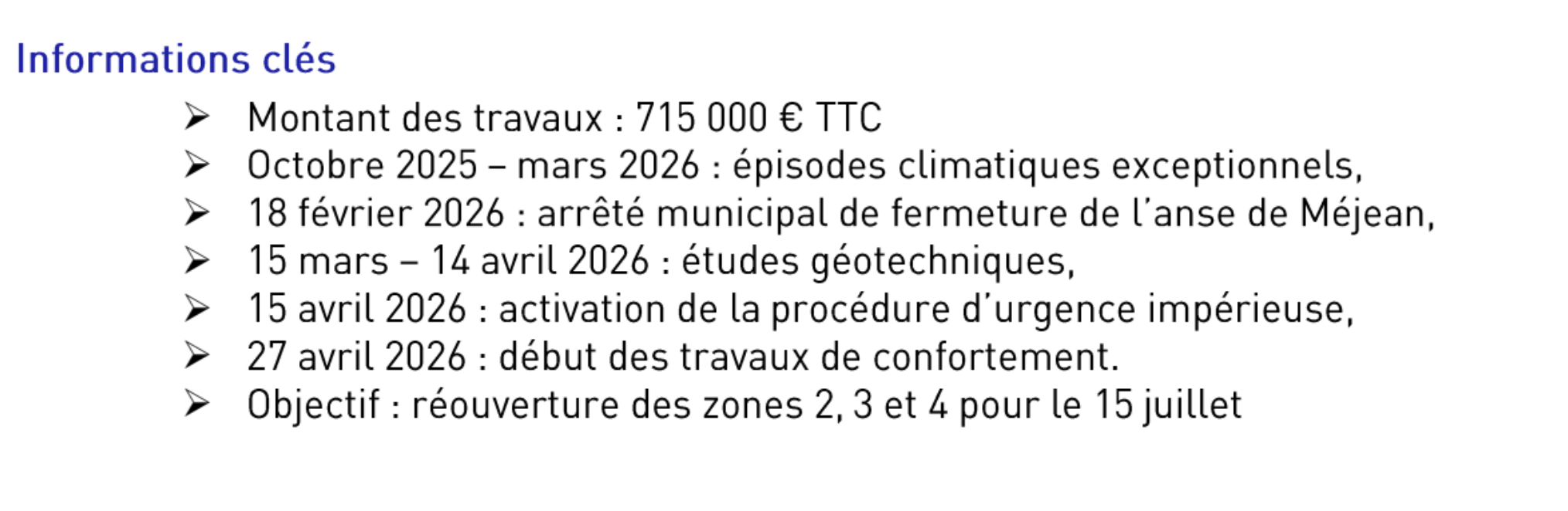Pour garantir la sécurité de tous, l’accès à l’anse Méjean est actuellement interdit. Le chantier devrait durer environ trois mois, sous réserve des conditions techniques et météorologiques.
